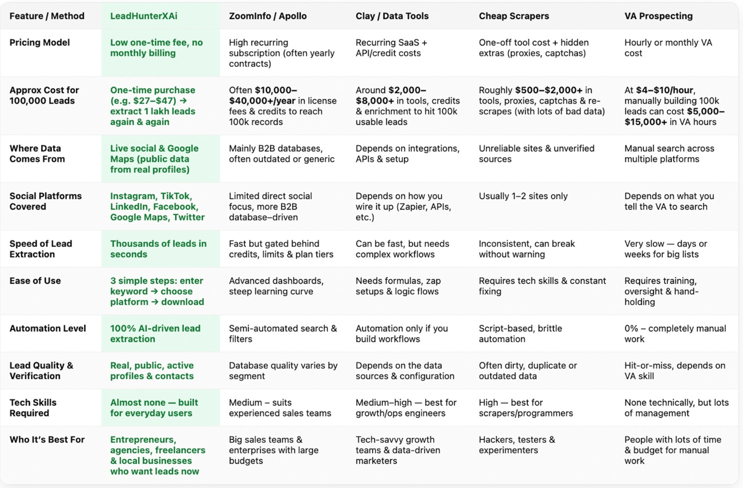 At $4-$10/hour, manually building 100k leads can cost $5,000- $15,000+ in VA hours |