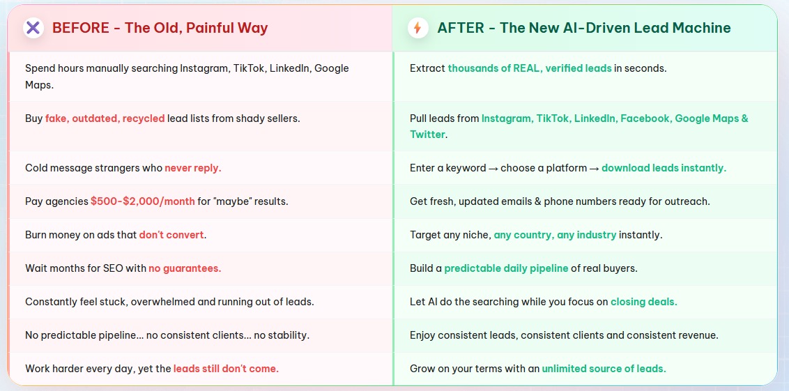 One-time purchase (e.g $27–$47) → extract 1 lakh leads again and again |
